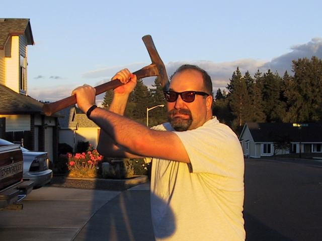 My friend Shane, part-time axe-wielding maniac and Star Wars fan. The picture was taken on a whim by mutual friend Scott Wirth before a camping trip (hence the axe) on Sept 22, 2000. After the trip (Scott himself being unable to attend), he mailed me the photo. So, lamenting my own lack of digital photos of the trip (my brand-new Olympus was DOA), I went to work on this one. |